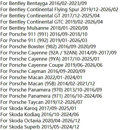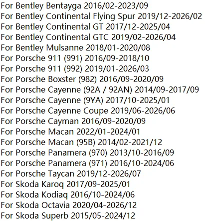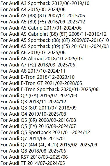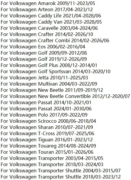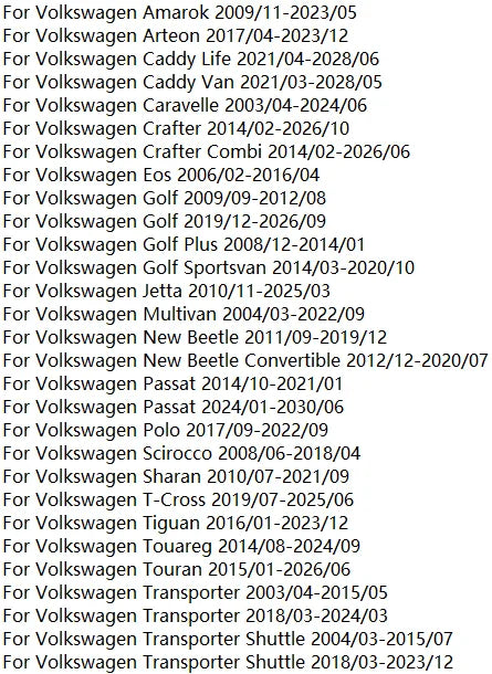 Fitment: For Volkswagen Amarok 2009/11-2023/05,For Volkswagen Arteon 2017/04-2023/12,For Volkswagen Caddy Life 2021/04-2028/06,For Volkswagen Caddy Van 2021/03-2028/05,For Volkswagen Caravelle 2003/04-2024/06,For Volkswagen Crafter 2014/02-2026/10,For Volkswagen Crafter Combi 2014/02-2026/06,For Volkswagen Eos 2006/02-2016/04,For Volkswagen Golf 2009/09-2012/08,For Volkswagen Golf 2019/12-2026/09,For Volkswagen Golf Plus 2008/12-2014/01,For Volkswagen Golf Sportsvan 2014/03-2020/10,For Volkswagen Jetta 2010/11-2025/03,For Volkswagen Multivan 2004/03-2022/09,For Volkswagen New Beetle 2011/09-2019/12,For Volkswagen New Beetle Convertible 2012/12-2020/07,For Volkswagen Passat 2014/10-2021/01,For Volkswagen Passat 2024/01-2030/06,For Volkswagen Polo 2017/09-2022/09,For Volkswagen Scirocco 2008/06-2018/04,For Volkswagen Sharan 2010/07-2021/09,For Volkswagen T-Cross 2019/07-2025/06,For Volkswagen Tiguan 2016/01-2023/12,For Volkswagen Touareg 2014/08-2024/09,For Volkswagen Touran 2015/01-2026/06,For Volkswagen Transporter 2003/04-2015/05,For Volkswagen Transporter 2018/03-2024/03,For Volkswagen Transporter Shuttle 2004/03-2015/07,For Volkswagen Transporter Shuttle 2018/03-2023/12,For Audi A3 Sportback 2012/06-2019/10,For Audi A4 2015/08-2024/06,For Audi A5 (B8) (8T) 2007/01-2015/06,For Audi A5 (B9) (F5) 2016/09-2023/12,For Audi A5 Cabrio 2017/01-2024/06,For Audi A5 Cabriolet (B8) (8T) 2008/11-2016/12,For Audi A5 Sportback (B8) (8T) 2009/07-2016/10,For Audi A5 Sportback (B9) (F5) 2016/11-2024/03,For Audi A6 2018/07-2025/06,For Audi A6 Allroad 2018/10-2025/03,For Audi A7 (F2) 2018/03-2025/06,For Audi A8 2017/10-2024/11,For Audi E-Tron 2018/12-2023/10,For Audi E-Tron GT 2021/02-2028/05,For Audi E-Tron Sportback 2020/01-2025/06,For Audi Q2 (GA) 2016/07-2024/03,For Audi Q3 2018/11-2024/12,For Audi Q3 (8U) 2011/07-2018/09,For Audi Q4 2019/10-2025/08,For Audi Q5 (8R) 2008/09-2016/08,For Audi Q5 (FY) 2016/09-2024/07,For Audi Q5 Sportback 2021/01-2024/12,For Audi Q7 2014/06-2015/01,For Audi Q7 (4M (4L, 4L1)) 2015/02-2025/09,For Audi Q8 2018/08-2025/06,For Audi RS7 2018/03-2025/06,For Audi TT 2014/07-2024/05