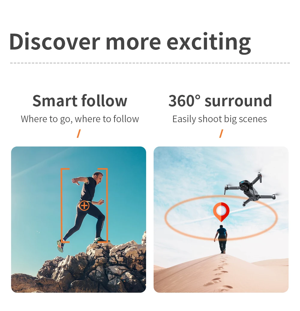 2. ① GPS smart follow: After the aircraft is connected to the GPS, open the APP follow function, and the aircraft will follow the mobile phone.②Image follow: 1-5m from the aircraft to identify the subject and automatically follow the flight.
